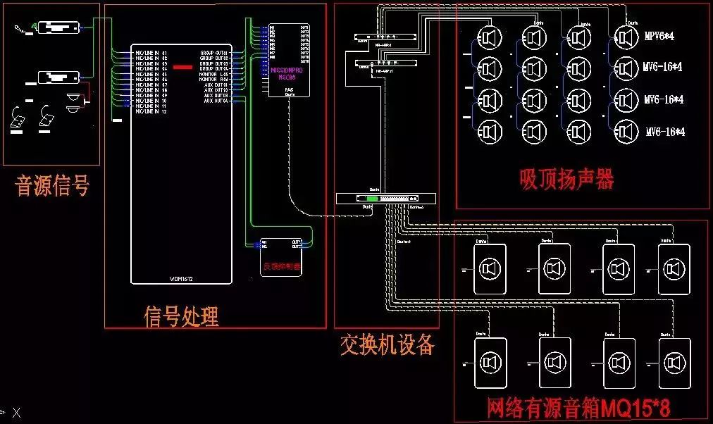 MQ-15為15寸有源音箱,通過Dante傳輸進入主交換機;MVP6內置功放Dante網絡傳輸的吸頂音箱,每只吸頂喇叭通過音箱線并聯三只MV6-16,最終通過一根網線進入系統MR-4RP交換機,同時給MVP6吸頂24V供電;MR-4RP通過網線連接主交換機。調音臺輸出模擬信號給音頻處理器,音頻處理器通過網線連接主交換機,無需輸出模擬信號,通過Dante網絡傳輸協議進行數據處理。最終以Dante controller軟件進行通道配備選擇。
