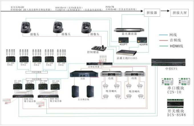 傳統音頻布線方式是每支麥克風都拉一條音頻線到機房,這樣不但施工復雜、管理不便、影響美觀,而且會使信號衰減,令原本清晰亮麗的人聲失真;針對此問題,軍區選用了名舞臺科技德捷品牌的DANTE網絡音頻轉換盒(DT-400 ),每四路音頻線進入網絡音頻轉換盒,轉換盒將前端CLOCKAUDIO的信號轉換成DANTE信號,無壓縮,無損耗地進入思美處理器,解決以上問題的同時,還可以實現IP網絡化管理;信號經由思美處理器處理后,通過百靈達音箱將高清音質傳送給與會人員。音頻部分實現了信號無壓縮,無損耗,無延時,高保真,強保密,智能控制,分配管理。