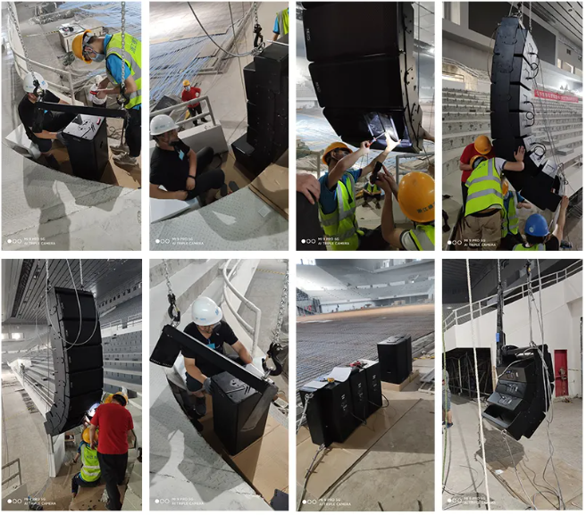 天博國(guó)際有限公司現(xiàn)場(chǎng)總負(fù)責(zé)人林社麟先生說(shuō)道:“我們現(xiàn)場(chǎng)進(jìn)行安裝工作的時(shí)間十分有限,因此我們?cè)诘孛嫔习丫€陣列音箱組裝起來(lái),并按照模擬軟件NS-1計(jì)算出來(lái)的角度和方向,調(diào)整好每個(gè)音箱,再把音箱吊掛到離地面十多米的位置固定好。再通過(guò)Dante網(wǎng)絡(luò)在電腦上使用NeMo軟件遠(yuǎn)程操控。將音量,增益,延時(shí),分頻點(diǎn)及輸出跳線設(shè)置好,并對(duì)音箱進(jìn)行檢查。最后這個(gè)體育館具有聲壓均衡且高清晰度的效果。”
