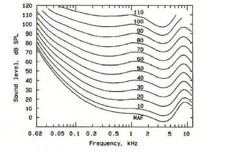換句話說,如果我們想讓100 Hz的音調與3.5 kHz的音調聽起來一樣大,100 Hz時的聲音必須比3.5 kHz時的聲音大上15 dB!(這里我們假設3.5 kHz的音調為85 dB SPL)