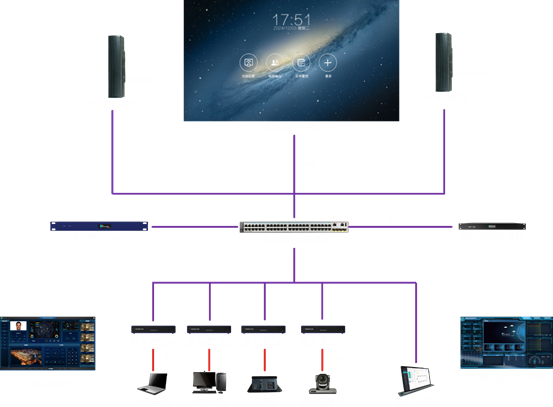 分布式音視頻系統(tǒng)能實(shí)現(xiàn)PC軟接入,授權(quán)安裝軟件在電腦上以后,電腦信號(hào)即可作為信息輸入進(jìn)入交換網(wǎng)絡(luò),供其他設(shè)備分配或者調(diào)用。并可在人機(jī)控制界面上控制電腦上的播放軟件,如暴風(fēng)影音等; 在授權(quán)電腦或者安卓設(shè)備或者ios設(shè)備安裝軟件后,即可從電腦或者其他平臺(tái)軟件觀看到所有接入本交換網(wǎng)絡(luò)的所有輸入信號(hào),非常容易的實(shí)現(xiàn)了高清分割的功能,人機(jī)友好得到極大的提高,大大提高了對(duì)大型會(huì)議調(diào)度人員的配合程度。