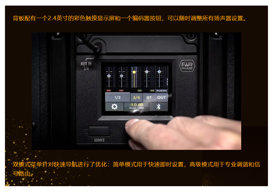 通過藍牙和基于觸摸的彩色顯示屏進行遠程音頻和控制,可全面管理以下內部功能: