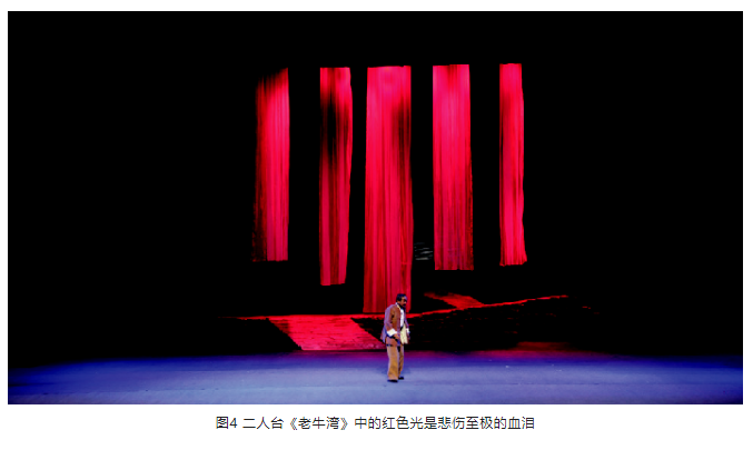 舞臺燈光有著其他舞臺元素無法比擬的語匯,在畫面中起著二次著色與統一畫面的作用。如果戲劇情緒與舞美、服裝的固有色有所沖突,燈光要以光色語匯為主,這時可以光色優先。一部優秀的作品,好的舞臺畫面,是在導演、舞美、燈光、服化、視頻的共同努力下取得的,特別是畫面的“留白”,更要與舞美設計多交流,只有在舞美“留白”的基礎上,燈光才能更好的給畫面“留白”。雖然舞臺畫面受諸多因素影響,但燈光是舞臺畫面的最后主宰者,怎樣才能得到理想的畫面,值得大家共同去探討。