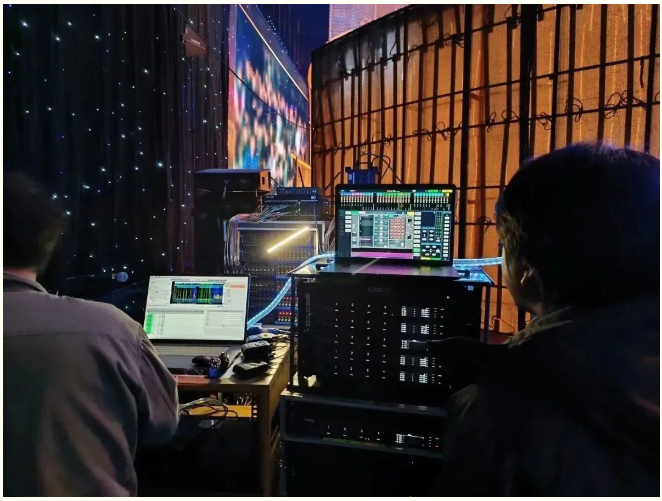 在前期進場搭建時,因遲遲無法確定PA控臺的最終位置,所以選擇了使用電腦端的Allen&Heath dLive director控制軟件與現場PA調音臺和OB調音臺的混音機架進行連接,從而快速方便地應用于前期的系統調試工作,使音頻工程師免于在3樓控臺到1樓舞臺之間奔波。
